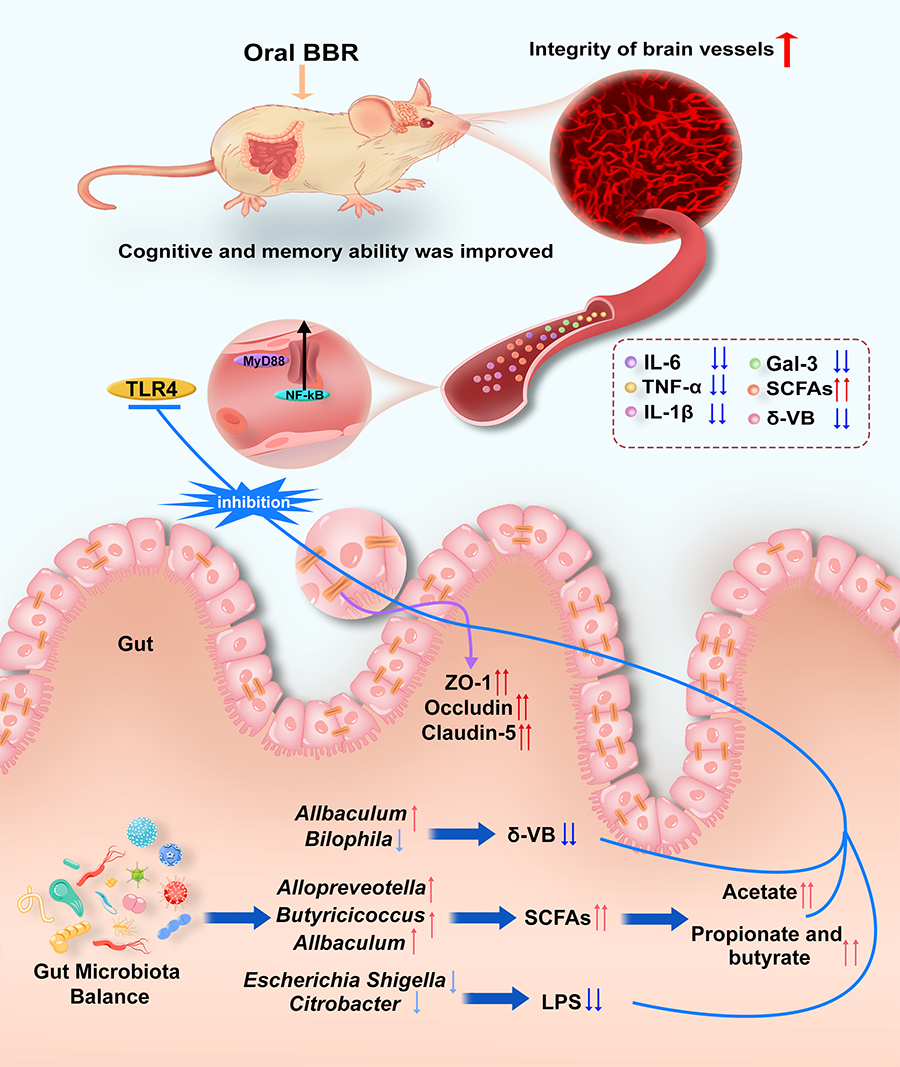 糖尿病患者因高血糖导致的认知障碍称为糖尿病脑病(DE),其患痴呆症的风险比非糖尿病患者高出约73%。DE发病机制复杂,临床上缺乏有效的治疗药物。本研究首次证明小檗碱(BBR)显著改善2型糖尿病脑病KK-Ay(2DEK)小鼠的认知功能。采用高分辨率的荧光显微光学断层扫描技术对BBR治疗前后2DEK小鼠的全脑组织进行成像,结果表明治疗后糖尿病脑病小鼠脑血管的完整性显著改善,包括不同脑区(PtA,CA1和CA3)的平均血管直径、血管长度或总血管体积的增加。进一步的机理研究表明,口服BBR调节了2DEK小鼠的肠道菌结构与功能,其中肠道菌代谢物δ-VB的产生被显著抑制。由于肠道δ-VB可被吸收入血,并可与TLR-4发生相互作用而激活血管上皮细胞TLR-4/MyD88/NF-κB炎症通路,因此BBR可能通过降低肠道δ-VB水平而保护DE小鼠的脑血管,进而改善2DEK小鼠认知和学习记忆能力。此外,BBR还通过调节产短链脂肪酸(SCFA)/ 脂多糖(LPS)细菌的丰度来增加SCFA的产生,并降低肠道中的LPS水平协同抑制TLR-4/MyD88/NF-κB炎症通路。总之,本研究发现肠道菌代谢物δ-VB是导致脑血管病变及认知障碍的可能机制,而BBR可通过下调肠菌中的δ-VB水平保护脑血管,从而改善DE。此研究是课题组继前期发现BBR可通过肠道菌增加脑中多巴/多巴胺改善帕金森病的基础上,再次阐释了BBR可通过抑制肠道菌δ-VB而改善DE(图1),这些研究对揭示我国天然药物通过肠道菌改善重大慢病的机理具有重要的理论指导和临床意义。