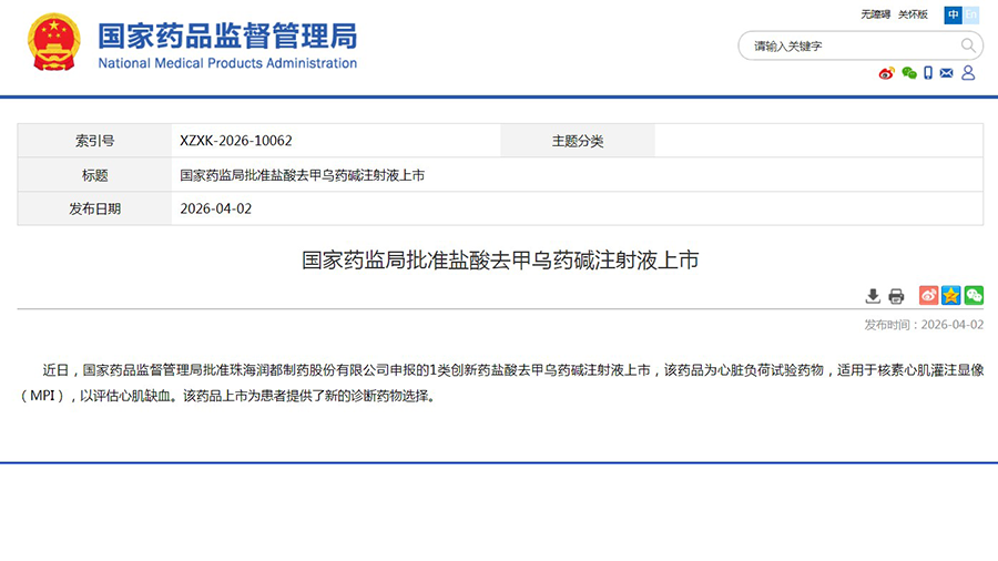 化药1类创新药盐酸去甲乌药碱注射液获国家药品监督管理局批准上市