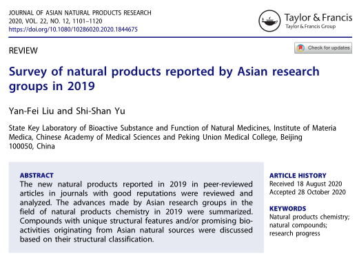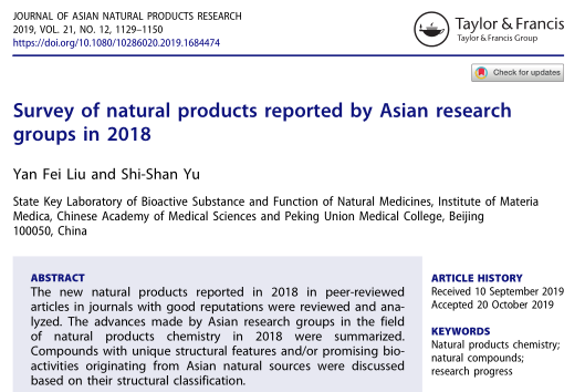 Survey of natural products reported by Asian research groups,是本刊自2017年设置的一个特色专栏,选取国际天然产物领域(分离/鉴定/全合成)影响力大、知名度高的17种期刊发表的论文,对其所包含的分离/全合成的化合物数量、种类和来源进行梳理、分析和总结,并选取亚洲科研工作者的代表性成果予以重点介绍。迄今为止已连续报道四年。每年综述报告亚洲天然产物研究领域的科研工作者在J. Am. Chem. Soc.、Org. Lett.、J. Org. Chem.、J. Nat. Prod.等高影响力国际期刊上发表的新结构/骨架化合物及其生物活性,以及代表性化合物的全合成研究成果。新化合物种类涉及单萜/环烯醚萜、倍半萜、二萜、二倍半萜、三萜、混源萜、生物碱、木质素、香豆素、黄酮、环肽和聚酮类等。新化合物主要来源于高等植物、海洋生物、真菌、细菌株和蓝藻,而且多具生物活性诸如细胞毒、抗炎、抗细菌、抗真菌、神经保护、降糖、抗结核、抗艾滋、抗乙肝/丙肝和抗疟等。中草药悠久的应用历史,使中国科学家在天然产物领域的研究具有显著优势。