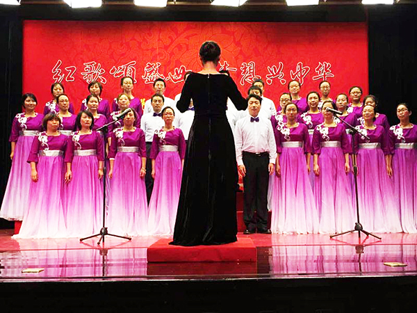 演出开始,各兄弟单位的合唱团纷纷登台亮相。药物研究所排在第八个上场,“药研之声”合唱团选择的曲目是《保卫黄河》、《我和我的祖国》。合唱团男团员身着白色衬衫,佩戴紫色领结,女团员身着紫色渐变白色长裙,在大红的舞台背景衬托下显得格外亮丽耀眼。随着指挥符瑜的手势扬起,激昂的钢琴声奏响,深沉有力的朗诵仿佛把人们又带到了那民族存亡的危急时刻,团员们饱含感情,倾力表演,圆润高亢的声音响彻整个礼堂。合唱团的精彩演出赢得了现场观众的热烈掌声。