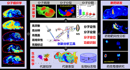 自主研制基于新型敞开式离子化技术(AFADESI)的免标记、便捷、高灵敏质谱成像系统与装置;在药物原位表征与作用机制、空间分辨代谢组学、肿瘤代谢和肿瘤分子病理诊断等应用中取得新进展,为生物医药研究提供创新手段。