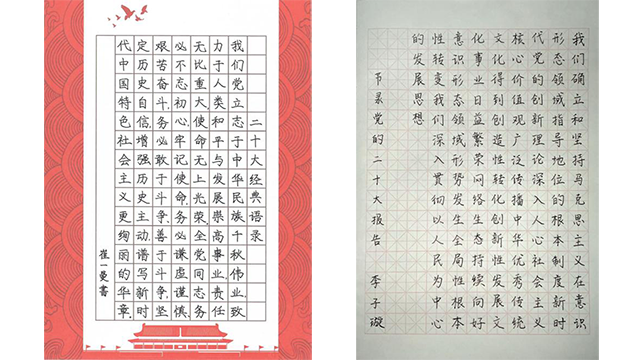 党的二十大是在迈上全面建设社会主义现代化国家新征程、向第二个百年奋斗目标进军的关键时刻召开的一次十分重要的大会。为深入汲取和学习党的二十大所传递的精神力量和丰富内容,2022级研究生党支部组织开展翰墨飘香映初心,丹青吐彩颂党恩——“学习贯彻党的二十大精神”书法比赛。比赛共征集到16份参赛作品,根据网络投票及专家投票(各50%)评选出一等奖1名,二等奖3名,三等级5名,参与奖7名。此次比赛圆满结束,比赛丰富了党的组织生活,引导广大同学把爱国情、强国志、报国行融入坚持和发展中国特色社会主义事业,实现中华民族伟大复兴中国梦的不懈奋斗之中。