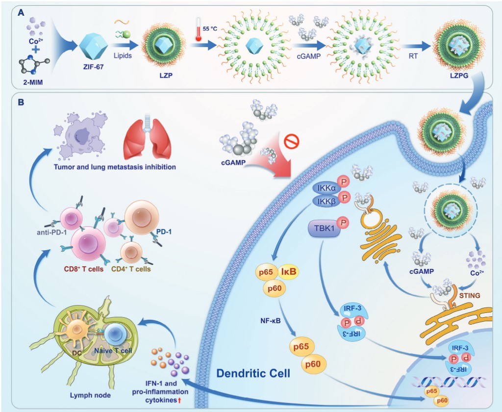 研究团队以金属有机框架为核心,并表面修饰脂质双分子层构建了一种仿生纳米载体LZPG,高效递送CDNs并协同激活STING通路。通过成膜-水化法制备纳米粒,采用主动包封法高效包载药物(cGAMP包封效率≈99%,较传统脂质体的水溶性药物载药方法提高了10倍以上),并能够拓展应用于其他环二核苷类药物。LZPG在酸性肿瘤微环境中富集、迅速释放cGAMP与金属离子,协同激活cGAS-STING通路,诱导I型干扰素及促炎细胞因子分泌,引发特异性T细胞应答。同时,LZPG通过减少调节性T细胞(Tregs)及促使M2型巨噬细胞向M1型极化,有效缓解免疫抑制性肿瘤微环境,诱导级联适应性免疫反应,高效抑制肿瘤生长。并且,该纳米药物在病人肿瘤样本中(乳腺癌和肝癌)同样能够特异性激活STING通路,展现出较好的临床应用潜力,为开发新一代癌症免疫治疗药物提供了工作基础。