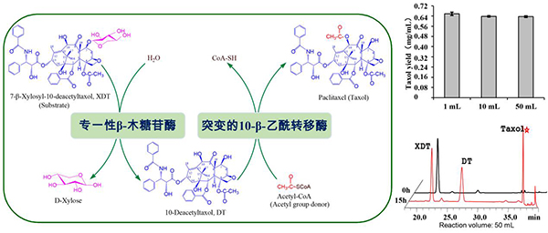 图 由7-木糖-10-去乙酰紫杉醇经一锅法全酶促合成紫杉醇示意图及部分研究结果.