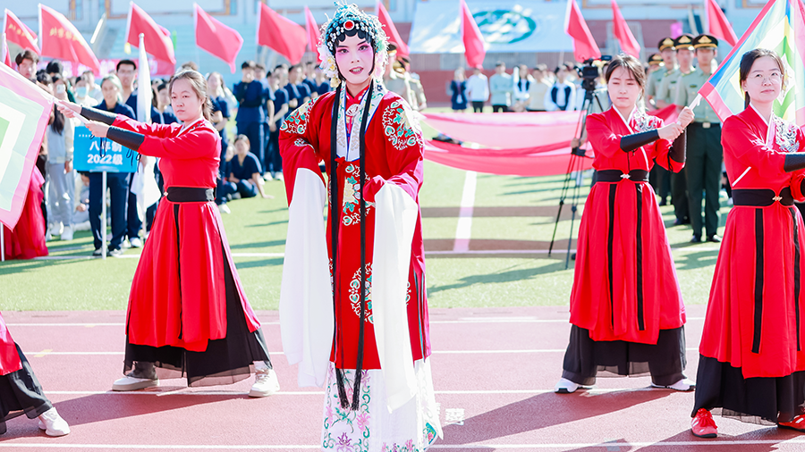 开幕式上,药物所方阵意气风发,斗志昂扬,创意节目成为全场焦点。范宇鹏同学以梅派经典《穆桂英挂帅》中“猛听得金鼓响画角声震”选段为蓝本,生动演绎了穆桂英挂帅出征、忠勇报国的英雄形象,以此致敬中国人民抗日战争暨世界反法西斯战争胜利80周年,展现了药物所学子勇于担当、奋发拼搏的精神风貌。