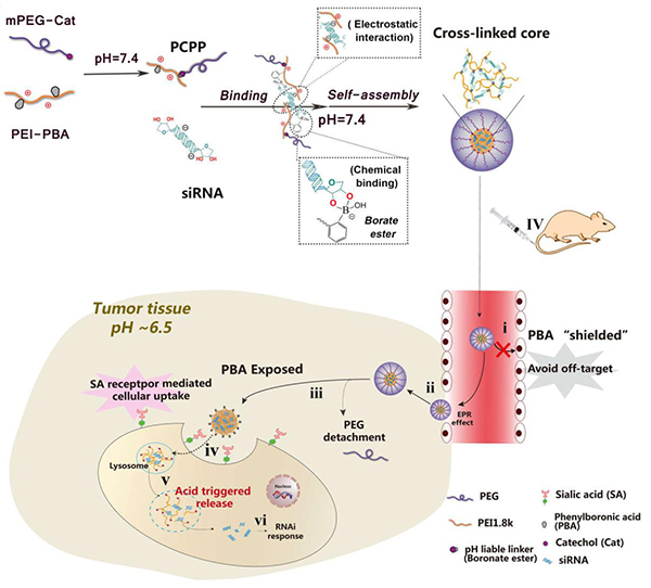 课题研究团队利用肿瘤组织酸性微环境的特点,首次构建了一种基于苯硼酸和顺式二醇相互作用原理的pH双敏感性纳米载体,可用于 siRNA静脉给药治疗恶性肿瘤。本研究是将苯硼酸(PBA)分子引入小分子量聚乙烯亚胺(PEI)合成PEI-PBA载体,然后通过PEI-PBA与儿茶酚(Cat)修饰的PEG进行顺式二醇缩合反应,合成PEG化修饰的新型载体PCPP。该载体可通过 PEI片段和siRNA的静电压缩以及PBA基团和siRNA发生化学键合的双重作用实现siRNA加载,制备的载siRNA 纳米粒可用于抗乳腺癌治疗。该纳米粒可通过 EPR 效应靶向聚集于肿瘤部位,在肿瘤组织弱酸性刺激下,PBA和Cat的结合键断裂,PEG可被有效脱除。通过PBA与肿瘤细胞表面唾液酸受体的相互作用,纳米粒被摄取入胞,在胞内溶酶体的酸性刺激下,PBA和siRNA之间结合的苯硼酸酯键断裂,实现siRNA 酸响应性释放,同时PEI的溶酶体逃逸作用使siRNA进入胞浆发挥治疗作用。