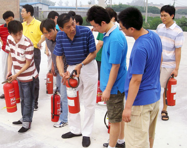培训班上首先放映了重大火灾发生的系列警示片和逃生自救的教育片。学员们又结合基地设施学习了绳锁系法和软梯的使用;演练了根据火灾发生时烟雾的走势及在黑暗中、烟雾中逃生的方法,如何利用现场条件和有效空间避免和减少因地震(相当6.5级)产生的伤亡等。参加培训的50余人还分批进行了实地灭火演习。