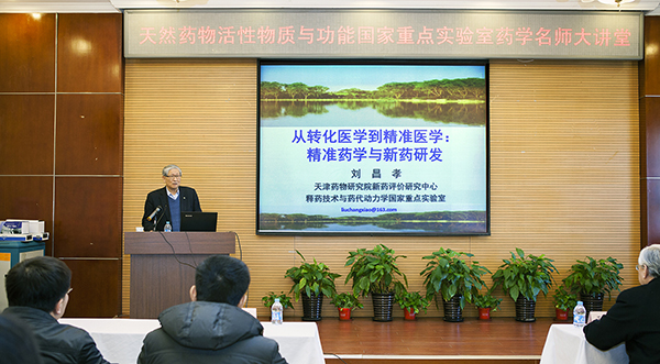 天然药物活性物质与功能国家重点实验室于2015年12月11日继续举办“药学名师大讲堂”。本次“名师大讲堂”特邀天津药物研究院药代动力学家刘昌孝院士主讲。国家重点实验室学术委员会主任于德泉院士、学术委员会副主任石建功研究员,重点实验室副主任朱平研究员以及重点实验室学术带头人、科研骨干和研究生100余人参加本次“大讲堂”。药物所副所长、国家重点实验室主任庾石山研究员主持会议。