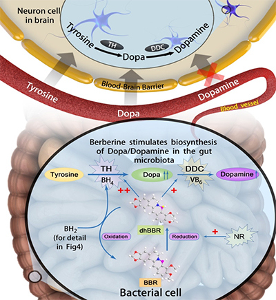 多巴胺主要在脑神经元细胞中合成。该论文发现了肠菌细胞中存在苯丙氨酸-酪氨酸-多巴-多巴胺的合成通路,而口服BBR可能通过二氢小檗碱(肠菌硝基还原酶产生的还原型BBR)提供H•并促进二氢生物蝶呤(BH2)转化成四氢生物蝶呤(BH4);增加的BH4增强了酪氨酸羟化酶(TH)活性,从而加速肠道细菌产生左旋多巴。肠菌产生的左旋多巴通过循环进入大脑,并转化为多巴胺。