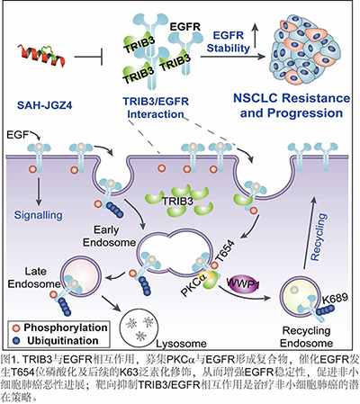 靶向EGFR 受体酪氨酸激酶的抑制剂(Tyrosinekinase inhibitors, TKIs)是目前非小细胞肺癌治疗的一线药物。然而由于T790M、C797S等获得性突变的出现,患者最后无可避免地发展为继发性耐药,成为限制EGFR-TKIs疗效的瓶颈。此外,肺癌患者中还存在野生型EGFR异常高表达的情况,这也是促进肺癌恶性进展及耐药的重要原因。因此,从全新角度探寻EGFR靶向策略对于克服肺癌耐药至关重要。