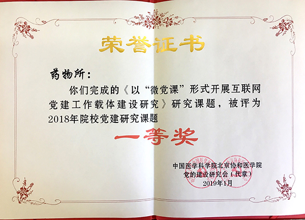 药物所机关二党支部申报并完成的课题《以“微党课”形式开展互联网党建工作载体建设研究》荣获2018年度院校党建研究课题一等奖。