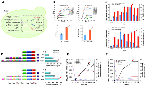 达玛烯二醇-Ⅱ(DM)、原人参二醇和原人参三醇是人参皂苷生物合成的关键中间体,后两者经糖苷化后即产生人参皂苷。但自然界中尚未发现达玛烯二醇-II糖苷。该团队通过大肠杆菌系统表达人参的两个糖基转移酶基因,重组酶能分别糖基化DM生成3β-O-Glc-DM和20S-O-Glc-DM。药理实验结果显示,3β-O-Glc-DM和20S-O-Glc-DM均具有良好的体内外抗结肠癌活性。之后,在酵母底盘细胞中分别重构和优化3β-O-Glc-DM和20S-O-Glc-DM的生物合成途径,经高密度发酵试验, 3β-O-Glc-DM和20S-O-Glc-DM的产量分别达到2.4 g/L和5.6 g/L(附图)。