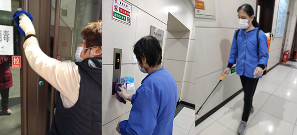 保洁人员无怨无悔,从清晨到傍晚,从院内到楼道,保洁着药物所的角角落落。她们每天定时对院内干道、卫生间、楼道、各会议室、垃圾场等公共区域进行喷洒消毒,并为电梯按键、门把手、门禁数次擦拭酒精,不遗落任何一个卫生死角。