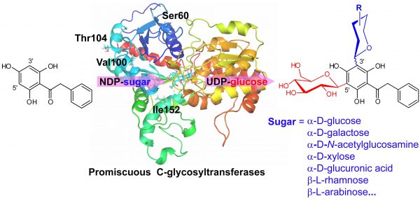 Bis-C-糖苷类化合物分子中含有两个相同或不同的C-糖基,结构新颖且具有多种药理活性,是一类潜在的药物先导分子。然而,bis-C-糖苷类化合物天然资源有限,化学合成困难,制约着该类化合物的来源、结构多样性及药物研究;酶法合成虽能克服上述不足,但能够催化bis-C-糖基化的C-糖基转移酶报道极少,且关键氨基酸及活性位点尚未被揭示。因此,阐明bis-C-糖基化的催化机制并进一步对其进行理性设计获得高效突变体酶是酶法bis-C-糖基化的关键科学问题。