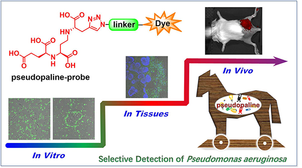 抗菌药物滥用导致的细菌耐药已经对全球公共卫生构成重大威胁。细菌感染的快速、精确诊断是减少抗生素滥用最直接有效的方法。细菌感染特异性分子探针结合医学分子影像技术,为细菌感染体内外快速、准确诊断提供了新思路。然而能够在复杂生物环境下,高特异性标记病原菌的分子探针和成像方法还十分有限。近日,中国医学科学院药物研究所胡海宇课题组与北京大学化学与分子工程学院雷晓光课题组合作,基于特洛伊木马策略发展了新型荧光探针,首次实现了铜绿假单胞菌在复杂生物环境中的快速、高特异性甄别,为铜绿假单胞菌体内外快速、精准诊断、指导临床用药提供可视化工具。研究成果以“A pseudopaline fluorescent probe for the selective detection of Pseudomonas aeruginosa”为题,于2020年10月19日在中国化学会旗舰期刊《CCS Chemistry》上发表。