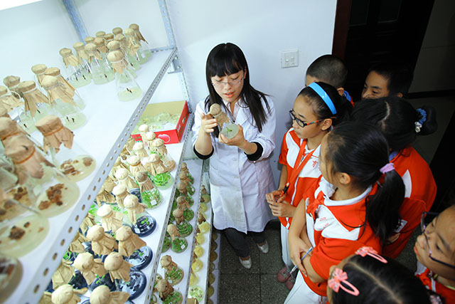 在分组参观实践过程中,我们为同学们安排了有趣的化学反应相关知识介绍及演示;从植物中提取分离有效成分的实物展示讲解,旋转蒸发仪、冷冻干燥机仪器的介绍;药理学知识的简介,动物学习记忆实验视频演示,显微镜观察正常细胞及癌变细胞等,实验动物小鼠的近距离观察;以及生物合成有关知识简介,药用植物等的快速培养……一系列同学们感兴趣的内容。最后,五年级的同学们还深入天然药物活性物质与功能国家重点实验室有关课题组实验室,进行了进一步的参观学习。