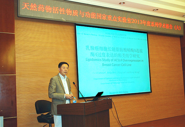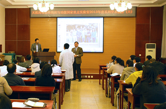 2013 年 10 月 23 日 下午,应 “ 天然药物活性物质与功能 ” 国家重点实验室邀请,加拿大阿尔伯特大学(University of Alberta) 厉良教授和美国纽约西奈山医学院(Mount Sinai School of Medicine) 王融教授到药物所作学术报告。学术报告由 “ 天然药物活性物质与功能 ” 国家重点实验室副主任再帕尔 · 阿不力孜 研究员主持。
