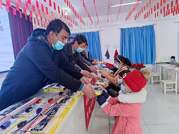 邻近边境,交通不便,邮政包裹经多方辗转最终于春节前夕传递到当地。在“访惠聚”驻村第一书记、新疆药物所副所长杨伟俊研究员的主持下,发放仪式隆重举行,图书和学习用具发放到最需要的孩子手中。