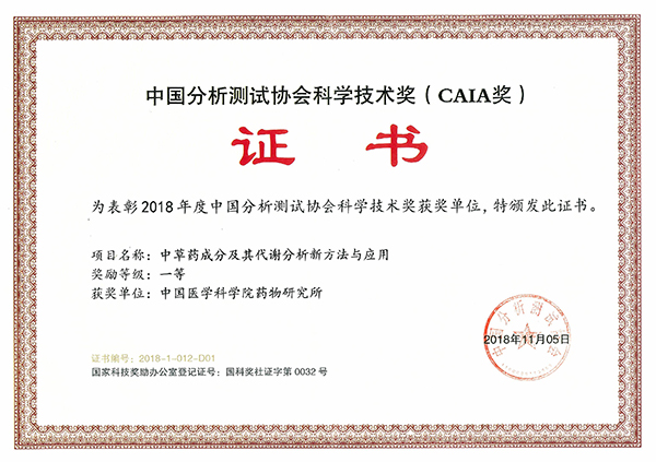 2018年12月6日,2018年度中国分析测试协会科学技术奖颁奖仪式在北京友谊宾馆隆重举行,由药物所张金兰团队完成的“中草药成分及其代谢分析新方法与应用”荣获2018年度中国分析测试协会科学技术奖(CAIA奖)一等奖,张金兰研究员作为团队代表接受张玉奎院士和江桂斌院士颁奖。