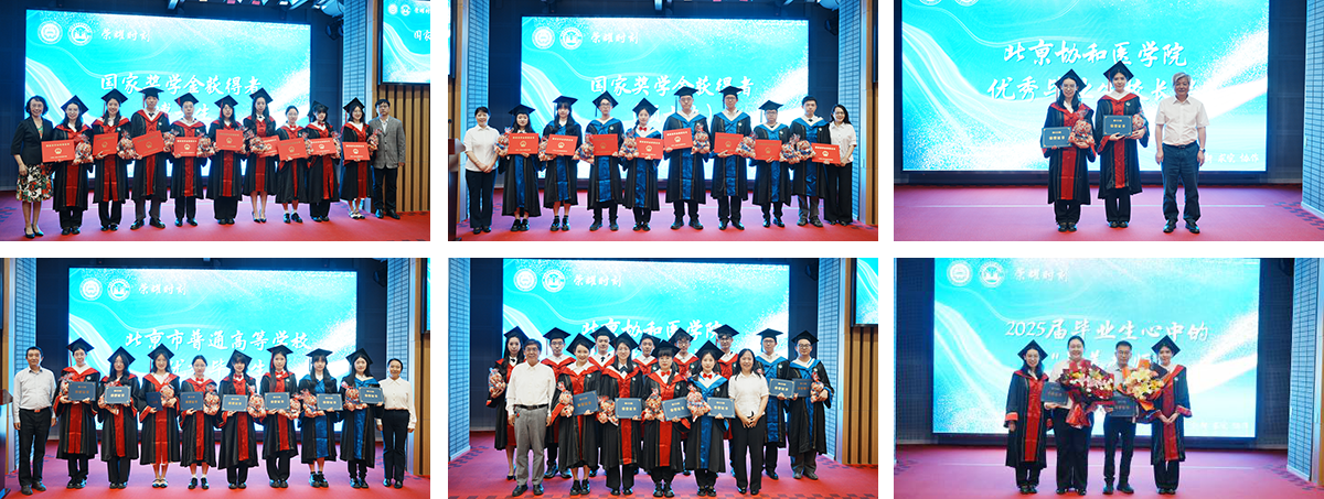 欢送会现场表彰了纪文明等18名国家奖学金获得者、杨辰和王施元两名北京协和医学院优秀毕业生校长奖、邓婉琪等8名北京市普通高等学校优秀毕业生、江海燕等12名北京协和医学院校级优秀毕业生,以及张培成和卢明月两名毕业生心目中的“最美教师”等荣誉获奖者。