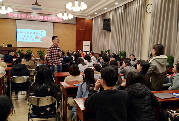 2018年11月22日,药物所教育处组织召开2018年度研究生求职经验交流会,特邀5名有代表性的往届毕业生回所与在校生进行面对面交流,分享求职过程中的经验和体会,近100名在校生参加了交流会。