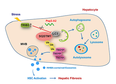 TRIB3与SQSTM1相互作用阻碍内体(MVB)的自噬性降解,并促进其向胞外释放富含INHBA的外泌体,活化肝星形细胞,进而诱导肝纤维化的发病。