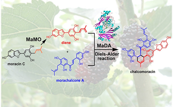 从2014年开始,戴均贵团队与北京大学化学与分子工程学院雷晓光教授以及中国中医科学院中药资源中心黄璐琦研究员研究团队通力合作,基于酶活性的蛋白分离纯化、蛋白质组及转录组学、生物合成中间体探针等多技术相结合的策略,从桑培养细胞中发现并鉴定了首个天然分子间[4+2]、单功能环化酶MaDA。