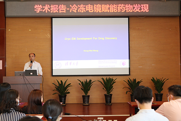 签约仪式后,王宏伟教授作了题为冷冻电镜赋能药物发现的学术报告,详细介绍了冷冻电镜技术以及对创新药物发现所起到的作用。药物所160余名师生聆听了报告。