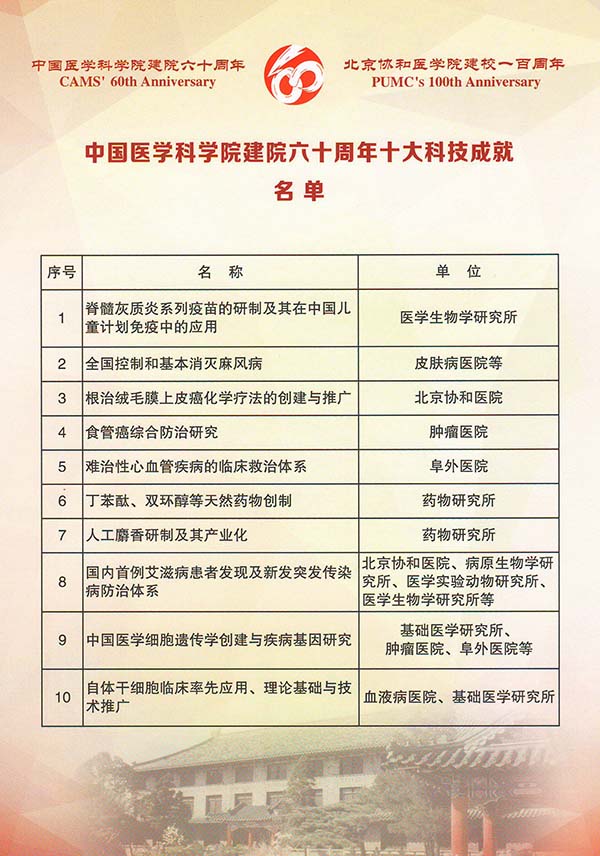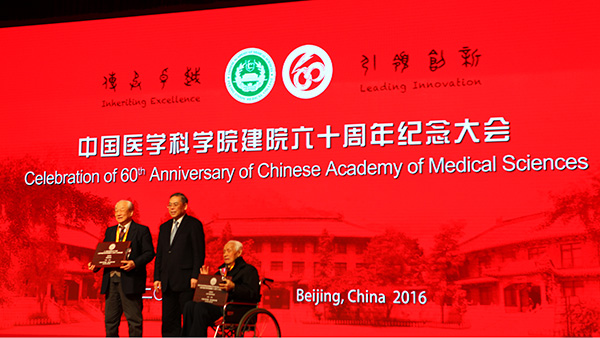 中国医学科学院建院60周年纪念活动“十大科技成就”颁奖仪式由中国医学科学院北京协和医学院党委书记李国勤主持,会上国家卫生计生委副主任刘谦向科学家代表于德泉院士颁发证书。院校长曹雪涛院士在致辞中讲到:院校将以建院六十周年庆祝活动为契机,全面做好卫生与健康科技创新,服务国家卫生与健康战略的需求,持续提升医学科技创新能力、医疗服务水平、医学教育质量,建成国家医学创新体系的核心基地,为建设健康中国和科技强国、为实现“两个一百年”奋斗目标做出新的更大的贡献。