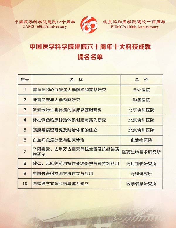 2016年10月28日,中国医学科学院迎来了建院60周年系列庆祝活动,并在当天发布了中国医学科学院建院60年“十大科技成就”及“十大科技成就”提名名单。药物所完成的两项科研成果“丁苯酞、双环醇等天然药物创制”和“人工麝香研制及其产业化”荣摘建院60年“十大科技成就”奖项,与此同时“我国兴奋剂检测方法建立与应用”获得建院60年“十大科技成就”提名奖。