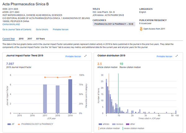 2020年6月29日,科睿唯安(Clarivate Analytics)发布了2019年期刊引证报告(Journal Citation Reports,JCR)。《药学学报》英文刊 (Acta Pharmaceutica Sinica B,APSB)2019年影响因子为 7.097,处于Q1区,位列全球270本Pharmacology & Pharmacy学科类期刊第13位! APSB创刊于2011年6月,2017年6月被SCIE收录。科学期刊是学科建设的重要部分,药物所重视期刊建设,并希望以此建成高端国际学术平台。