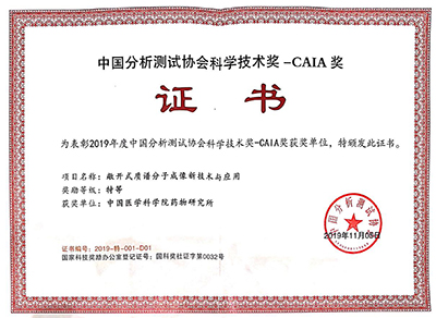 2019年12月6日,2019年度中国分析测试协会科学技术奖(CAIA奖)颁奖仪式在京举行,药物所再帕尔教授课题组“敞开式质谱分子成像新技术与应用”荣获2019年 CAIA奖特等奖。获奖项目主要完成人:再帕尔·阿不力孜,贺玖明,孙成龙,罗志刚,宋肖炜,李铁钢,何菁菁,黄罗娇,陈杰,毛歆歆。合作完成单位:北京协和医院。