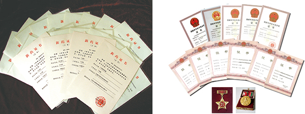 此外,还研制了我国第一个强心甙药物强心灵、第一个改善微循环治疗休克的药物山莨菪碱(654-2)、国内外首创中药一类新药人工麝香、第一个妇产科用药麦角新碱、第一个前列腺素类终止妊娠药物卡孕栓(PG05)、第一个化学合成抗病毒外用药酞丁安、第一个维甲类皮科用药维胺酯、第一个具有国际自主知识产权的抗肝炎一类新药双环醇(百赛诺)、第一个治疗缺血性脑卒中一类新药丁苯酞(恩必普)、第一个通过计算机设计创制的治疗骨关节炎原创新药艾瑞昔布……