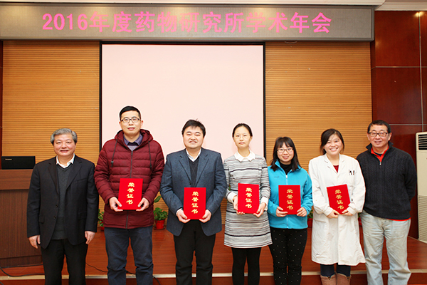 年会期间还举行了2016年药物所“梁周黄于刘青年科技奖”颁奖仪式,蒋建东所长、庾石山副所长为五位获奖者颁奖,并由一等奖获得者林媛做了题为“新型抗结核先导物的发现与分子药理学研究”的报告。