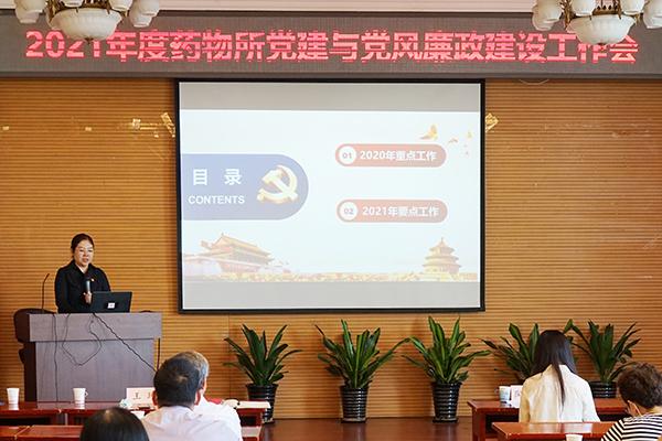 党委副书记(主持工作)、副所长王珂对药物所2020年度党建工作进行总结并部署2021年度党委重点工作。她围绕疫情防控、党的全面领导、基层党组织建设、从严治党、统战群团老干部工作等方面阐述。她指出,要把开展党史学习教育、做好百年庆祝活动作为年度重点工作抓实抓细,确保从党史中汲取经验、智慧和力量,要以强有力的政治监督保障“十四五”规划顺利实施,奋力开启工作新局面。王珂同志还向大会通报了药物所领导班子2020年度民主生活会情况。