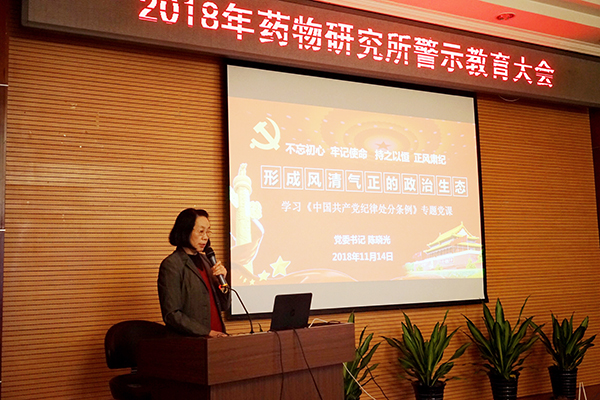 为深入贯彻落实上级警示教育工作要求,2018年11月14日,药物所召开警示教育大会,药物所领导班子成员、党委委员、纪委委员、各党支部书记及支部委员、各科室主任、各行政部门及辅助科室正副负责人、各企业负责人、人财物重点岗位人员、党员代表、入党积极分子等约150人参加了会议。党委书记陈晓光主持会议。