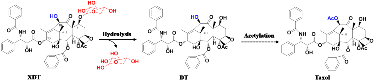 目前紫杉醇的主要来源有红豆杉苗圃栽培和以10-去乙酰巴卡亭III(分离自欧洲红豆杉等的枝叶)为原料的化学半合成,这两种方式初步实现了红豆杉资源的可持续利用。但红豆杉植物在产生紫杉醇的同时还产生7-木糖紫杉烷等紫杉醇类似物,尤其是7-木糖-10-去乙酰紫杉醇(XDT),该化合物在西藏红豆杉和中国红豆杉等植物中含量十分丰富,最高可达树皮干重的0.5%,而紫杉醇的树皮含量一般在0.02%左右。这类物质作为废弃物丢弃,既污染环境又造成资源浪费。我国目前有多家红豆杉林场,7-木糖-10-去乙酰紫杉醇原料来源充足,如果在提取天然来源紫杉醇的同时也能将这些废弃物“变废为宝”地转变成紫杉醇以增加紫杉醇的供应量,不仅具有重要的经济和社会意义,而且具有重要的环保意义。XDT在水解去除木糖基后生成10-去乙酰紫杉醇(DT),后者经C10位乙酰化即为紫杉醇(如图所示)。